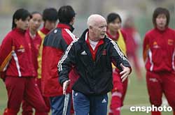 一月二十九日,中國女足在泉州對陣對陣德國隊前進行訓練。圖為中國女足技術(shù)顧問基斯·布倫特向女足隊員講解戰(zhàn)術(shù)。作者:盛佳鵬