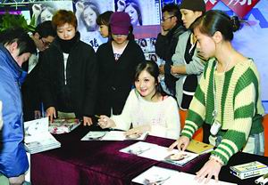 不少歌迷為了能搶占到與娜拉親密接觸的最佳位置,一大早便趕到音像店內(nèi)等候。當娜拉帶著招牌式的可愛笑容現(xiàn)身時,現(xiàn)場數(shù)百名歌迷立刻炸開了鍋。簽售過程中臺下眾人你推我攘好不熱鬧,拿到簽名的歌迷興奮地聚在一起展示自己的“戰(zhàn)果”,即便是不買專輯的顧客也駐足在人群外觀看。現(xiàn)場近乎失控的局面讓稀有文化工作人員一邊忙著維持臺上的秩序,一邊忙著呼吁臺下歌迷不要擁擠耐心等待。無奈娜拉的無敵萬人迷魅力,讓不少原本負責維持秩序的音像廣場工作人員和保安都被徹底征服,不時地伸長脖子去看臺上的娜拉。而記者通道的管理人員只顧把關記者的進入,絲毫不理會周遭擁擠的歌迷。(朱雅清)