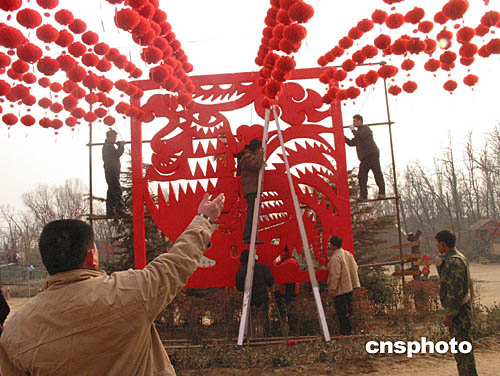 二月一日,一幅直徑四米的中國(guó)剪紙《吉祥如意圖》在河南鄭州搭建完畢。這是為2005春節(jié)商城民俗文化廟會(huì)主會(huì)場(chǎng)而建。該剪紙根據(jù)中國(guó)傳統(tǒng)剪紙技法、經(jīng)過(guò)三天的時(shí)間精心設(shè)計(jì)制作出來(lái)的,在歷年同類廟會(huì)中,該圖最大。春節(jié)廟會(huì)結(jié)束后將申請(qǐng)吉尼斯世界記錄。作者:慎重