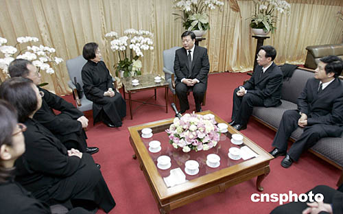 孫亞夫、李亞飛今天下午抵達臺北,四點三十五分前往靈堂吊唁辜振甫先生。圖為吊唁后與其家人座談。(臺灣海基會故董事長辜振甫先生治喪工作小組提供)中新社記者:邢利宇