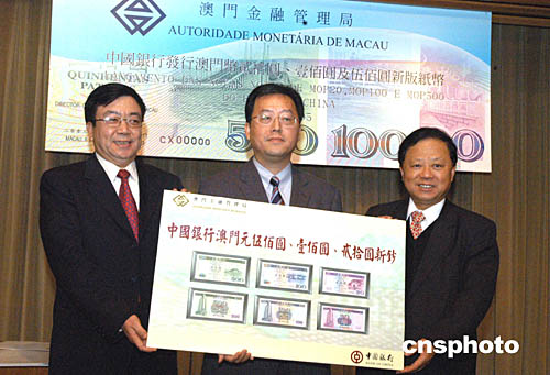 澳門金融管理局行政委員會主席丁連星、 中國銀行澳門分行總經(jīng)理張鴻義、中國印鈔造幣總公司總經(jīng)理賀林向人們展示三款澳門新版鈔票。