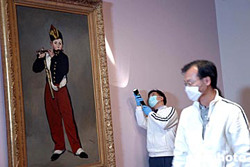 圖為藝術館工作人員精心布置愛德華·馬奈名畫《吹笛子的男孩》。