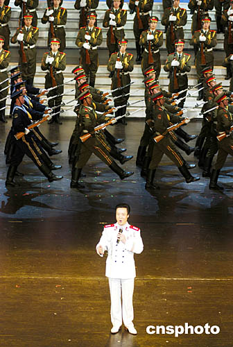 眾多解放軍文藝工作者歷時(shí)三個(gè)月創(chuàng)作的2005年軍民迎新春文藝晚會(huì),二日晚在北京中國(guó)劇院隆重與廣大軍民見(jiàn)面。圖為解放軍總政治部歌舞團(tuán)歌唱演員閻維文與中國(guó)人民解放軍儀仗大隊(duì)官兵,表演男聲獨(dú)唱與軍體操《軍旗下的我們》。中新社記者:王麗南