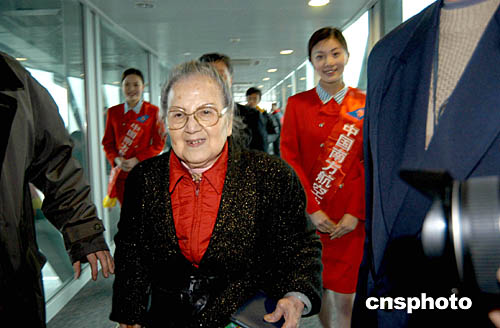 圖為今年已經(jīng)八十六歲梁老太,在兒子的陪同下,成為第一個(gè)走出機(jī)艙的旅客。作者:劉衛(wèi)勇