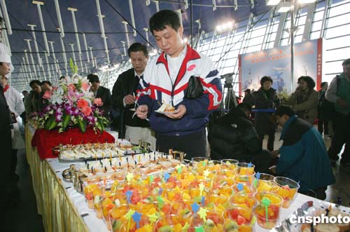 二月五日上午,東方航空公司為搭乘臺灣中華航空臺商春節(jié)包機的CI——五八五號航班返臺過年的旅客,準(zhǔn)備了精美食品。作者:湯彥俊