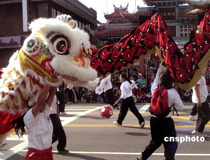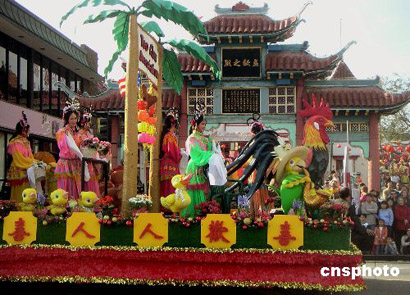 美國(guó)洛杉磯華埠二月十二日舉行第一百零六屆金龍大游行。圖一為賀歲彩車駛過(guò)唐人街,向華洋民眾祝賀中國(guó)農(nóng)歷雞年新春佳節(jié)的到來(lái)。圖二為華人和各種族民眾共同歡慶中國(guó)農(nóng)歷雞年。圖三為廣東潮州會(huì)館的金雞仙女彩車,為美國(guó)洛杉磯華埠二月十二日舉行的一百零六屆傳統(tǒng)金龍大游行錦上添花。 作者:賈國(guó)榮