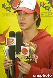 歌星王力宏2月18日在香港出席商業(yè)電臺(tái)節(jié)目“叱咤樂(lè)壇”錄音訪問(wèn),他向傳媒展示可以避邪的金屬飾物。作者:鄧慶樂(lè)