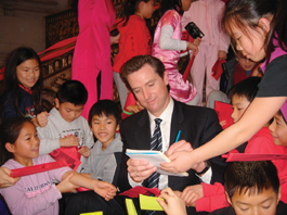 來自尤方玉屏中文學(xué)校的數(shù)十位小學(xué)生成為慶會的另一亮點,這些滿臉稚氣的學(xué)童,排排坐在通往二層的樓梯上,簇?fù)碇贻p英俊的紐森市長,就像遇到偶像明星一樣,紛紛向他索要簽名。