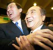 中新網(wǎng)2月24日電 據(jù)臺(tái)灣媒體報(bào)道,國民黨主席連戰(zhàn)夫婦昨晚返回臺(tái)灣,約有近四十名“立委”及七十名黨部人員前往接機(jī),黨主席熱門人選的“立法院長”王金平、臺(tái)北市長馬英九都提早在機(jī)場等待,親民黨則派出秘書長秦金生、“立院”黨團(tuán)總召集人劉文雄到場接機(jī),王馬兩人還多次互相擁抱,展現(xiàn)團(tuán)結(jié)氣氛。