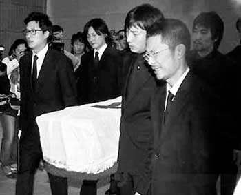 7時(shí)30分左右,文根英代表參加告別儀式的電影人宣讀了追悼詞———“善良、誠實(shí)的你就像火花一樣一閃而過,就這樣永遠(yuǎn)離開了我們……你的笑容和你的聲音、你的一舉一動(dòng)都會(huì)留在我們的心中……你帶著最美好的回憶和美麗的心,安心地走吧……”接著是由池成朗讀了韓國著名詩人的悼念詩。最后,李恩珠生前好友BADA和歌手全仁權(quán)分別通過歌聲來追悼故人,通過歌曲表達(dá)了無比的悲痛和遺憾。BADA現(xiàn)場(chǎng)演唱了李恩珠平時(shí)最喜歡的頌歌,這時(shí)參加儀式的所有人開始給李恩珠獻(xiàn)花,為故人的靈魂祈福,愿她一路走好。