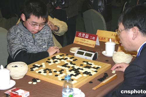 今天上午,在簡(jiǎn)短的開(kāi)幕式后,比賽正式拉開(kāi)帷幕。結(jié)果,聶衛(wèi)平最小的徒弟“小胖”古靈益執(zhí)黑在與師傅的對(duì)決中最先告捷,由于盤(pán)面不足,聶衛(wèi)平以超時(shí)告負(fù),再次印證了古靈益作為“九段高手克星”的名號(hào)。朱元豪二段爆冷將邵偉剛九段挑下馬,首屆“西南王”楊一五段以一又四分之一子戰(zhàn)勝第二屆“西南王”古力七段,俞斌、王磊、王堯、周鶴洋、王煜輝分別戰(zhàn)勝對(duì)手晉級(jí)八強(qiáng)。