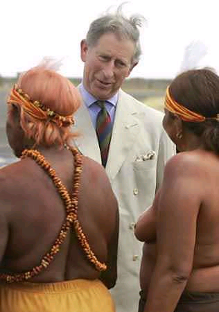 3月2日,查爾斯前往澳大利亞內(nèi)地進(jìn)行訪(fǎng)問(wèn)。王儲(chǔ)一抵達(dá)愛(ài)利斯泉,就由赤裸著上身的土著婦女熱情迎接,王儲(chǔ)看得兩眼不知該往哪里瞧才好。土著人又給他端上一桌蟲(chóng)蟲(chóng)大餐,更讓王儲(chǔ)吃不消。