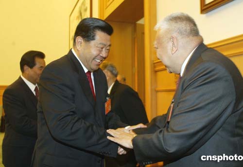 三月三日,全國(guó)政協(xié)十屆三次會(huì)議在北京人民大會(huì)堂開幕,全國(guó)政協(xié)主席賈慶林和香港特首董建華在會(huì)前互致問候。作者:廖文靜