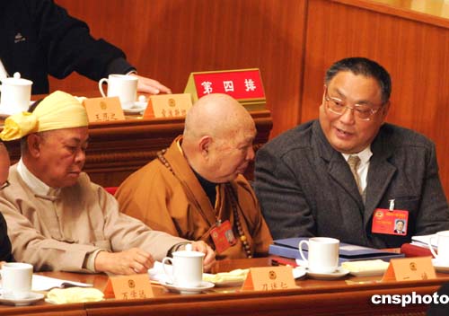 全國政協(xié)十屆三次會議三月三日在北京人民大會堂舉行,中國殘聯(lián)主席鄧樸方(右)出席大會時與其他委員交談。作者:湯彥俊
