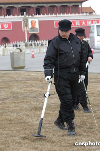 全國政協(xié)十屆三次會議三月三日下午三點在北京人民大會堂隆重開幕,會議開始前,警員對天安門廣場進行安全檢查。作者:毛建軍
