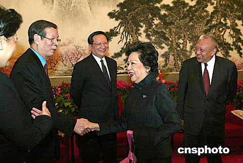 國(guó)家主席胡錦濤三月五日在北京會(huì)見(jiàn)香港特別行政區(qū)行政長(zhǎng)官董建華,國(guó)務(wù)委員唐家璇、國(guó)務(wù)院港澳辦主任廖暉等在會(huì)見(jiàn)后與特首夫人互致問(wèn)候。作者:滿會(huì)喬