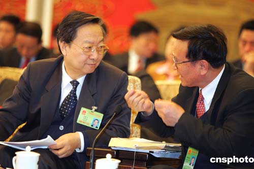 國家安全生產(chǎn)監(jiān)督管理總局局長李毅中(左),三月七日到全國人大遼寧代表團參加審議政府工作報告,聽取該團代表關(guān)于安全生產(chǎn)問題的發(fā)言。作者:湯彥俊