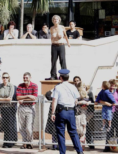 查爾斯王子在人群中間走來走去的時(shí)候,一名當(dāng)?shù)貗D女突然脫下上衣,露出胸部所寫的一行字:“把殖民地的恥辱從我乳房上移走”。先前不久,即查爾斯王子抵達(dá)新西蘭之后不久,就有一名懷抱孩子的婦女當(dāng)眾露胸,表示對查爾斯的抗議。該婦女很快就被警察帶走,目前已經(jīng)以擾亂社會秩序罪遭到起訴。