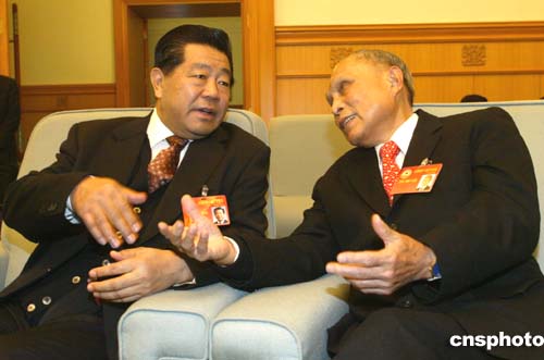 全國政協(xié)十屆三次會議第三次全體大會三月九日在北京人民大會堂舉行。全國政協(xié)主席賈慶林與副主席霍英東在會前交談。作者:廖文靜