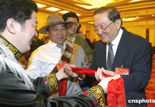 三月十一日,全國(guó)人大四川代表團(tuán)在北京人民大會(huì)堂審議全國(guó)人大常委會(huì)工作報(bào)告和“兩高”報(bào)告,藏族人大代表為參加審議的中央政法委員會(huì)書(shū)記羅干獻(xiàn)上象征尊貴的紅色哈達(dá)。作者:廖文靜