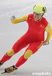三月十二日在北京首都體育館舉行的二00五年短道速滑世界錦標(biāo)賽女子五百米比賽中,中國選手楊揚(yáng)、王濛、付天余發(fā)揮出色,包攬前三名。圖為楊揚(yáng)奪冠后慶祝。作者:武仲林