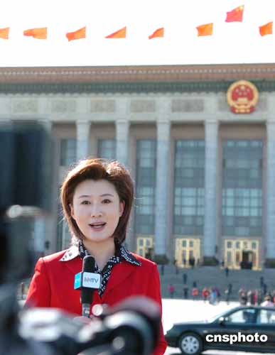 三月十二日下午,內(nèi)蒙古電視臺(tái)主持人李琳在北京人民大會(huì)堂外現(xiàn)場(chǎng)報(bào)道全國(guó)政協(xié)十屆三次會(huì)議閉幕大會(huì)。作者:陳文