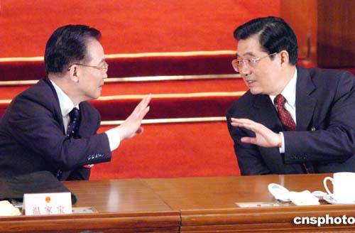 圖:胡錦濤與溫家寶在主席臺上交談