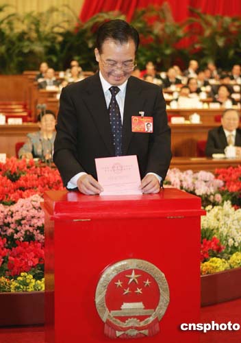 十屆全國(guó)人大三次會(huì)議第四次大會(huì)三月十三日在北京人民大會(huì)堂舉行,胡錦濤在會(huì)上當(dāng)選為中華人民共和國(guó)中央軍事委員會(huì)主席。圖為國(guó)務(wù)院總理溫家寶投票。作者:毛建軍