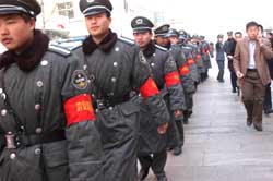 | 北京保安執(zhí)勤隊員三月十五日為“3.15”消費者日大型活動值勤。北京市保安服務(wù)總公司是我國成立最早、規(guī)模最大的保安服務(wù)公司之一。截止2003年8月,總公司所屬共有28家保安分公司,1家保安科技發(fā)展中心,保安從業(yè)人員53000余人,保安人防客戶單位4300多家,技防客戶單位2100多家,保安服務(wù)遍及全市各行各業(yè),包括聯(lián)合國駐華機構(gòu),外國駐華使館,外國商社,政府機關(guān),金融機構(gòu),大專院校,賓館飯店,商場超市、集貿(mào)市場、繁華街區(qū)、居民社區(qū)等,已初步形成了覆蓋全市的、人防與技防緊密結(jié)合的新型安全防范網(wǎng)絡(luò)。作者:鄒憲