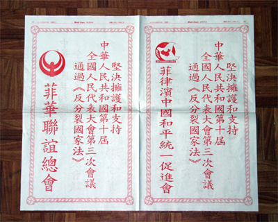 3月14日,《反分裂國(guó)家法》以高票通過后,菲律賓中國(guó)和平統(tǒng)一促進(jìn)會(huì)、菲華各界聯(lián)合會(huì)、菲律賓晉江同鄉(xiāng)會(huì)、菲律賓中國(guó)洪門致公黨總部、菲律賓石獅同鄉(xiāng)會(huì)、菲律賓僑中學(xué)院等社團(tuán)和文教單位,立即在各大華文報(bào)紙上刊登大幅套紅賀詞,堅(jiān)決擁護(hù)和支持全國(guó)人大通過的《反分裂國(guó)家法》。