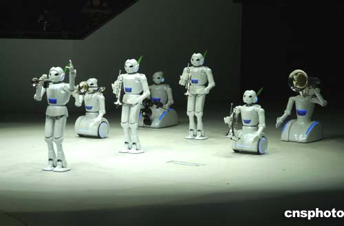 日本愛知世博會從三月十八日至二十日舉行正式開幕前的預(yù)覽會,各展館的展出內(nèi)容紛紛揭秘。圖為由豐田公司開發(fā)的機(jī)器人樂隊(duì)在展場進(jìn)行音樂表演。這組吹奏樂機(jī)器人的神奇之處,在于擁有靈敏的手指和口唇,可以如同人類演奏員一般靈巧而準(zhǔn)確地演奏各種樂曲。作者:王健