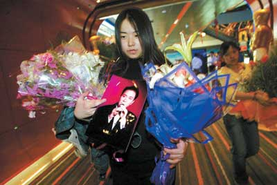 雖然張國榮已經(jīng)離開了近兩年,但是他的影迷卻一直沒有忘記他。昨天,當記者來到影片《異度空間》首映式現(xiàn)場時發(fā)現(xiàn),現(xiàn)場已經(jīng)聚集了上百位張國榮的影迷,在影片海報旁擺滿了他們送來的白玫瑰和白百合,上面還插著“哥哥”的生前照片。而影院也配合播放著張國榮的歌曲,很多歌迷也在小聲地隨著哼唱。