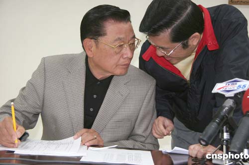 三月二十八日,中國國民黨副主席江丙坤率團(tuán)赴大陸參訪。圖為江丙坤(左)與同行的國民黨發(fā)言人張榮恭在一起商量行程。作者:董會峰