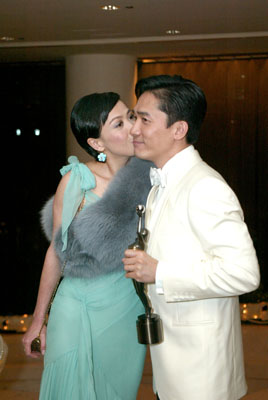 “偉仔”與嘉玲在頒獎禮結(jié)束不久即抵達慶功宴會場,五度稱帝的他一直面露笑容,上臺領(lǐng)獎時的緊張一掃而空,嘉玲更即場吻賀男友。“偉仔”解釋,他上臺時的心情就好像第一次拿獎一樣緊張,因他已因為《花樣年華》里的周慕云而奪得影帝,今次在《2046》里再演同一個角色,要能夠拿兩次獎,難度非常高。因此,他對獲獎感到十分開心,但同時又承認并不覺得太意外,因他之前已憑《2046》奪得香港電影評論學(xué)會的“最佳男演員”獎,自然也想再在金像獎得獎。對于成為五屆影帝,他只以“好彩”來形容,說自己運氣好,王家衛(wèi)“腳頭”也好。另外,出爐影后章子怡繼續(xù)其“少話”本色,慶功宴上仍來去匆匆,不肯多談感受,只表示很開心,已經(jīng)即時致電家人及朋友報喜。