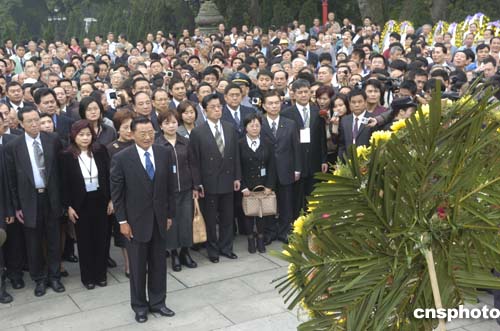 上午十點(diǎn),拜謁儀式正式開(kāi)始。江丙坤代表國(guó)民黨主席連戰(zhàn)及全體國(guó)民黨黨員向烈士敬獻(xiàn)花圈。參訪(fǎng)團(tuán)所有成員均向烈士三鞠躬致敬。隨后宣讀的祭文中寫(xiě)道:“壯哉先烈,死以報(bào)國(guó),身毀名榮,英風(fēng)義烈,永為世率。”