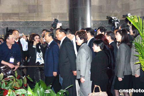 | 三月三十日上午九點(diǎn),國民黨參訪團(tuán)拜謁中山陵的祭拜儀式正式開始。江丙坤代表中國國民黨主席連戰(zhàn)及全體國民黨黨員向中山陵敬獻(xiàn)花籃。參訪團(tuán)所有成員均向?qū)O中山遺像三鞠躬并默哀一分種。圖為參訪團(tuán)所有成員在孫中山陵寢旁繞場一周,瞻仰孫中山遺像。作者:陳旻