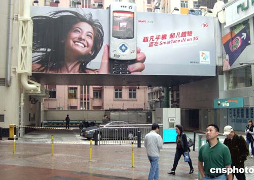 香港街頭廣告種類繁多,在銅鑼灣鬧市區(qū)所展現(xiàn)的巨型立體手機(jī)廣告更令人奪目。作者:譚達(dá)明