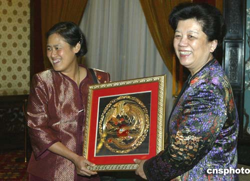 國(guó)務(wù)委員陳至立在北京向泰國(guó)公主詩(shī)琳通贈(zèng)送了一幅中國(guó)K金龍鳳繡作為五十歲生日禮物。作者:廖文靜