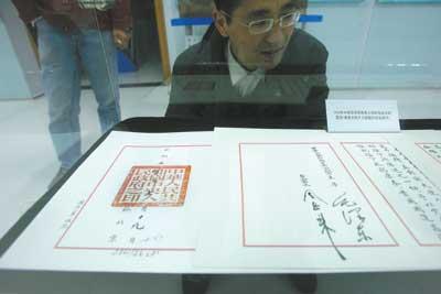 在100平方米左右的展廳里,存放在玻璃展柜中的一份顏色微紅、長(zhǎng)約一米的文件特別顯眼,文件的右側(cè)有兩個(gè)紅色的繁體大字“國(guó)書(shū)”。這是1950年由我國(guó)首任駐瑞典大使耿飆呈遞給瑞典國(guó)王的國(guó)書(shū)復(fù)制件,完全按照當(dāng)年新中國(guó)第一批國(guó)書(shū)的標(biāo)準(zhǔn)復(fù)制,大小及式樣與原件一模一樣。它是特別從瑞典外交部那里復(fù)制得來(lái)的,因?yàn)閲?guó)書(shū)是交給外國(guó)的,本國(guó)自己不保存。