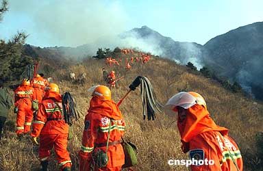 4月4日,河北省井徑縣南王莊鄉(xiāng)蘆莊村的金華寺山旅游景點,發(fā)生大面積火災。河北省森林防火應急分隊武警緊急出動300余名兵力趕赴火災現(xiàn)場,經過5個多小時的激烈奮戰(zhàn),終將熊熊大火撲滅。據(jù)查大火由清明燒紙引發(fā)。圖為武警官兵奔赴目的地。作者:余洪恩