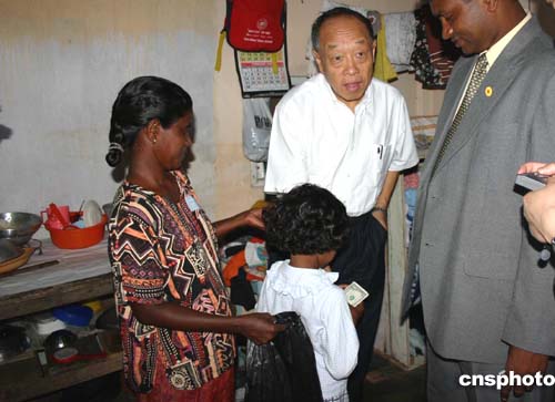 中國外長李肇星四月九日陪同溫家寶總理走訪斯里蘭卡海嘯災(zāi)區(qū)。李肇星走進(jìn)災(zāi)民家中,從口袋里取出現(xiàn)金捐給災(zāi)民。作者:齊彬