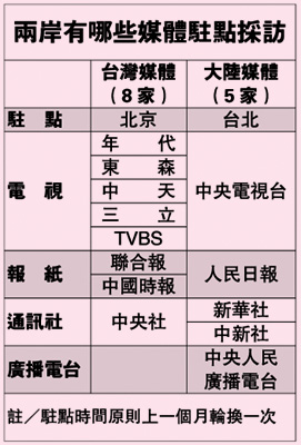 兩岸開放媒體記者采訪,大陸方面先于臺灣。1996年12月,國臺辦公布“關(guān)于臺灣記者來祖國大陸采訪的規(guī)定”,正式開放臺灣媒體到大陸采訪,目前有8家臺灣媒體派記者原則以1個月一輪方式,定期到北京采訪。
