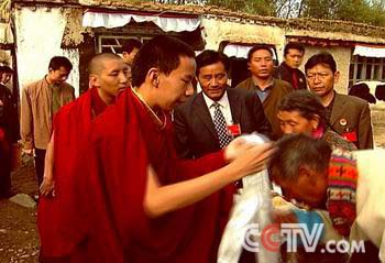 班禪:本來是我給廣大的信眾灌頂是第一次。不僅僅這樣。信教群眾為了信仰來要求灌頂,而我是為了滿足他們這種需求。灌頂授法,祈禱,沒有疾病,沒有災難,為他們祈禱。