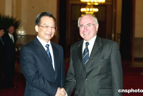 霍華德贊同溫家寶對兩國關(guān)系的評價和對今后雙邊關(guān)系發(fā)展的看法。他說,近年來,澳中關(guān)系得到全面發(fā)展,各領(lǐng)域合作順利進(jìn)行,尤其是能源合作卓有成效,成為兩國經(jīng)貿(mào)合作的重要組成部分。這一良好的合作勢頭可以擴(kuò)大到其他領(lǐng)域。因此澳決定承認(rèn)中國的完全市場經(jīng)濟(jì)地位,愿與中方啟動自由貿(mào)易協(xié)定的談判,以深化兩國經(jīng)貿(mào)關(guān)系與合作。澳方愿與中方共同努力,本著積極負(fù)責(zé)的態(tài)度和互利共贏的原則,推動兩國經(jīng)貿(mào)關(guān)系的進(jìn)一步發(fā)展。澳方對兩國合作的前景持樂觀態(tài)度。