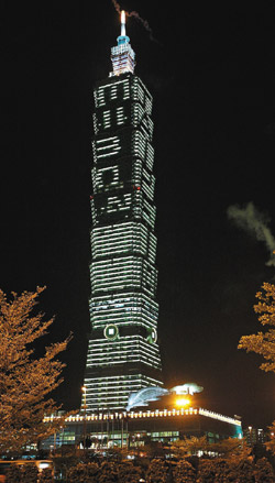據(jù)臺(tái)灣聯(lián)合報(bào)報(bào)道,臺(tái)北101大樓18日晚先行試燈,清晰可見大樓北面有著相對(duì)論公式E=mc2,大樓西面有著TAIPE。