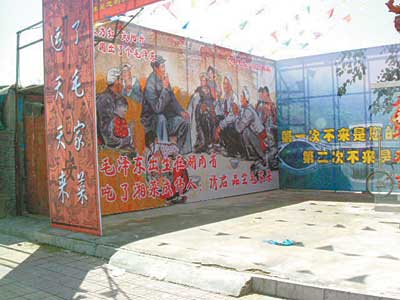 北京海淀區(qū)一家酒樓把毛主席與農(nóng)民座談時(shí)的場(chǎng)景設(shè)計(jì)為廣告牌,懸掛在店外,并寫著“吃了湘菜成偉人”的廣告語(yǔ)。