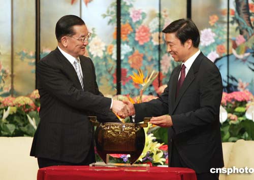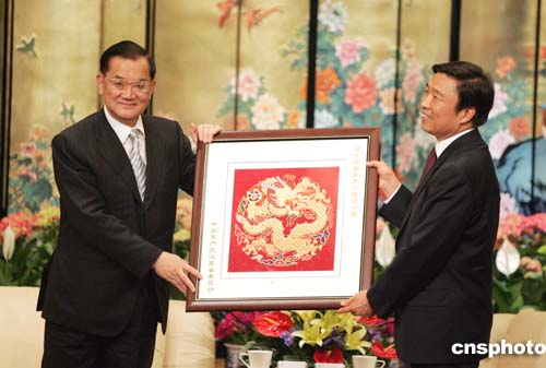 會見時,中共江蘇省委向訪問團(tuán)贈送了過去專為皇家制造、現(xiàn)成為南京藝術(shù)象征的絲織工藝品“金絲團(tuán)龍”,李源潮說,龍是中華民族的象征。連戰(zhàn)主席也回贈了一件臺灣名家制作的工藝品三羊開泰瓷瓶。連戰(zhàn)說,以此祝愿江蘇發(fā)展、興旺。
