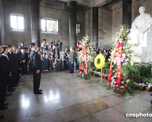 二十七日九時二十四分,肅立、敬獻鮮花、司儀恭讀《祭告總理文》,中國國民黨主席連戰(zhàn)與國民黨大陸訪問團全體團員在肅穆莊嚴的中山陵祭堂孫中山先生坐像前深深三鞠躬。