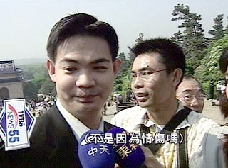 第三次來(lái)到南京中山陵,連戰(zhàn)的大公子連勝文,一路走來(lái)輕松,但被問(wèn)到是不是為情消瘦,連勝文把國(guó)父都搬出來(lái)當(dāng)作擋箭牌,表示今天來(lái)的地方很神圣,不適宜問(wèn)這種八卦話題。倒是第一次來(lái)到南京的弟弟連勝武趕快出面幫哥哥解圍,表示是因?yàn)楣ぷ鞣敝夭畔荨?object align="left" classid="clsid:D27CDB6E-AE6D-11cf-96B8-444553540000" codebase="http:///pub/shockwave/cabs/flash/swflash.cab#version=5,0,0,0" height="250" hspace="2" vspace="2" width="350">