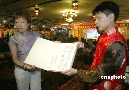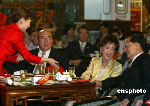為了迎接這位“鄰家大哥”,老舍茶館的服務員分別穿上了只有在重大節(jié)日才穿的大褂和旗袍。茶館總經(jīng)理尹智君說,茶館是以辦喜事的心情來迎接連戰(zhàn)大哥及其率領的訪問團,我們希望他到這里就象到了家似的。環(huán)顧茶館三樓演出大廳,木質(zhì)的廊窗,精雕細制中不失大家氣度,高掛的各式大紅的宮燈,褐色的硬木八仙桌。金色椅墊的背靠椅,黃白花紋的細磁蓋碗都透著濃郁的京味。